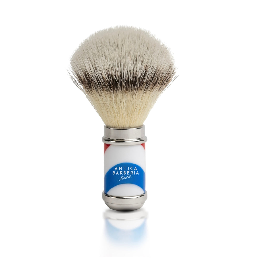 The 'Barbiere' Special Collection set features handles in hand-turned, polished resin with polished, chromed brass metal accents with the vivid striping of the iconic barber's pole. The very high quality finish gives the razor and brush handle an extraordinary water resistance over time.
