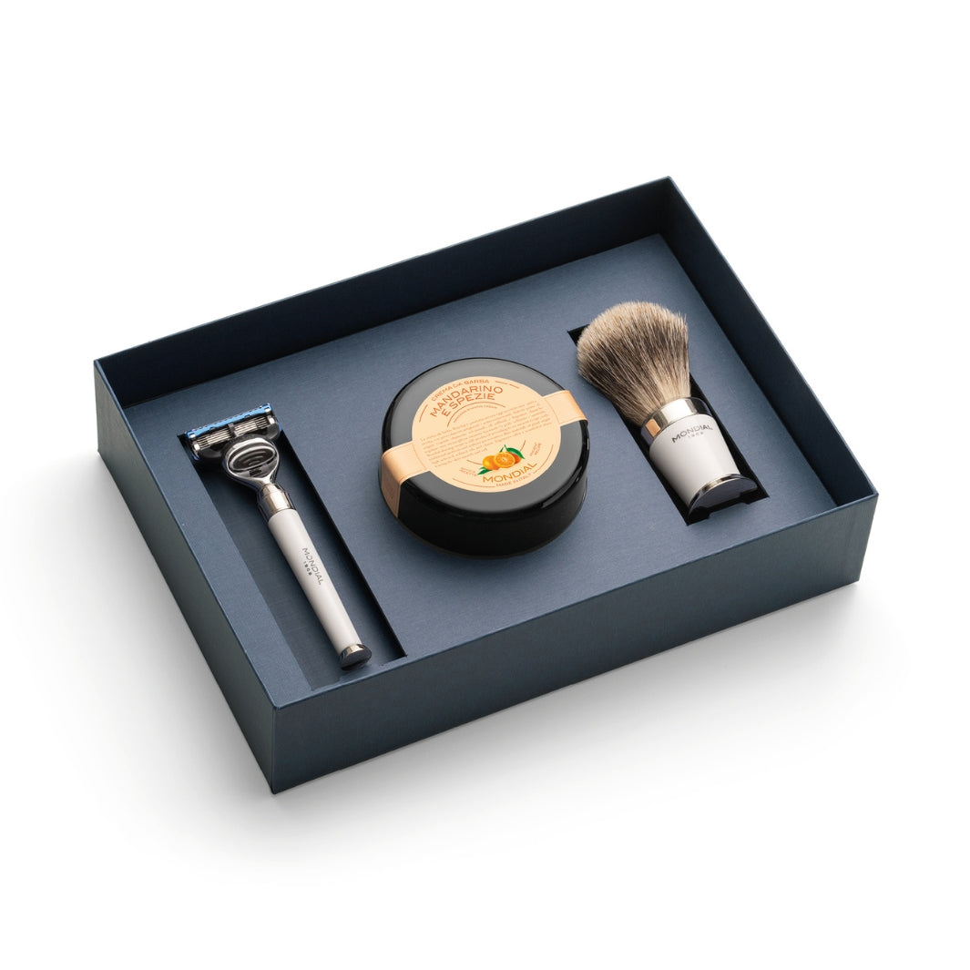 The three-piece wet shaving gift set from Mondial 1908 is a special gift to any man looking to redefine the expectations for his daily shave with high-quality tools from our 'Premium' collection along with one of our ancient recipe shaving creams.