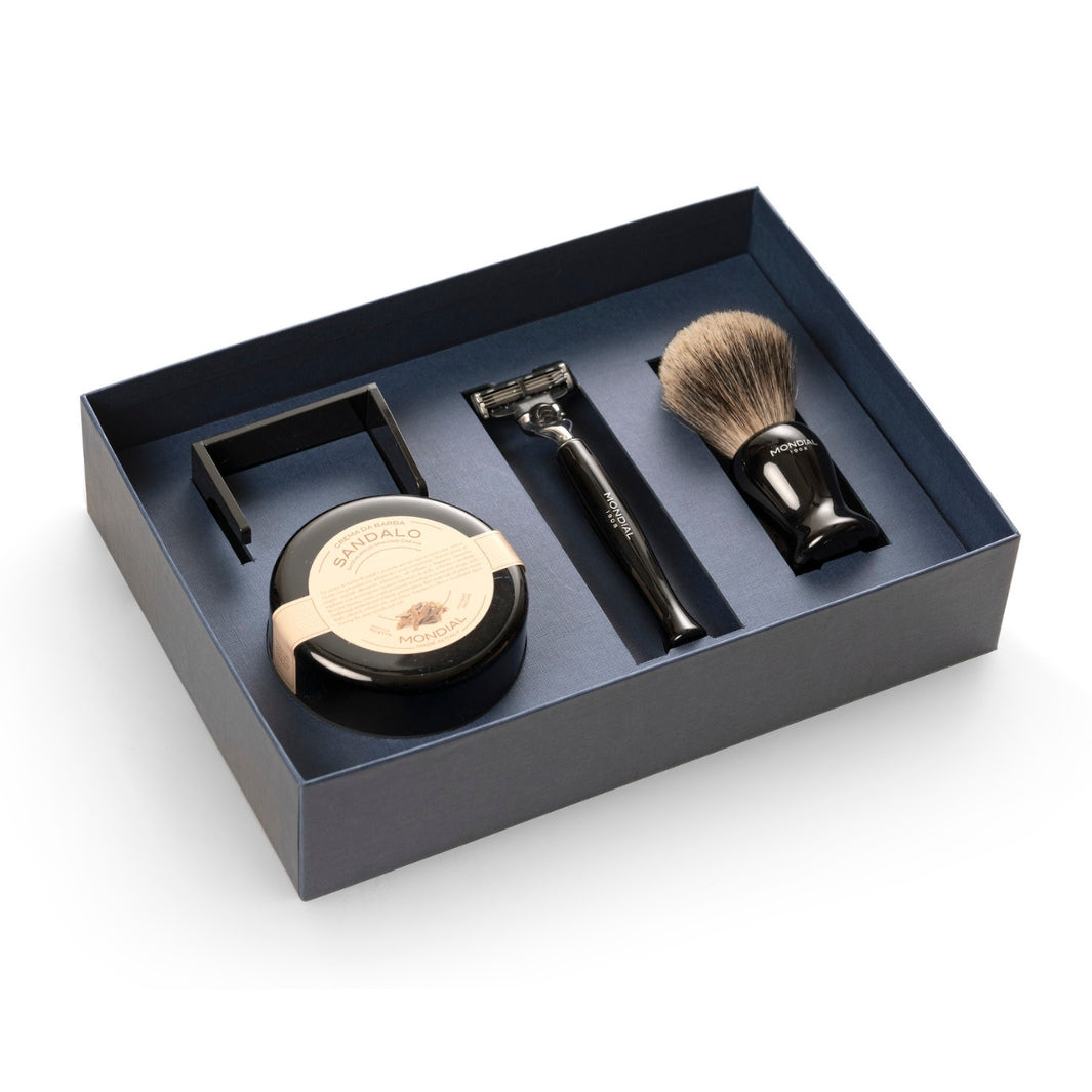 Set includes: Gibson Collection Mach3 Cartridge Razor Handle, Best Badger Shaving Brush, Acrylic Brush Stand & Sandalwood Shaving Cream